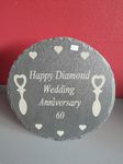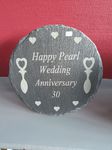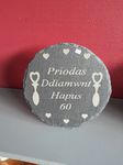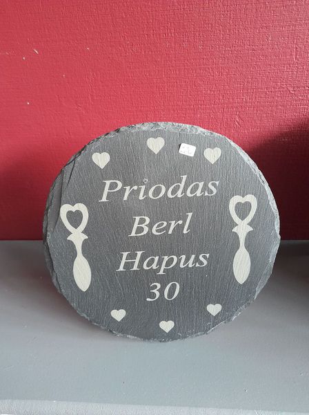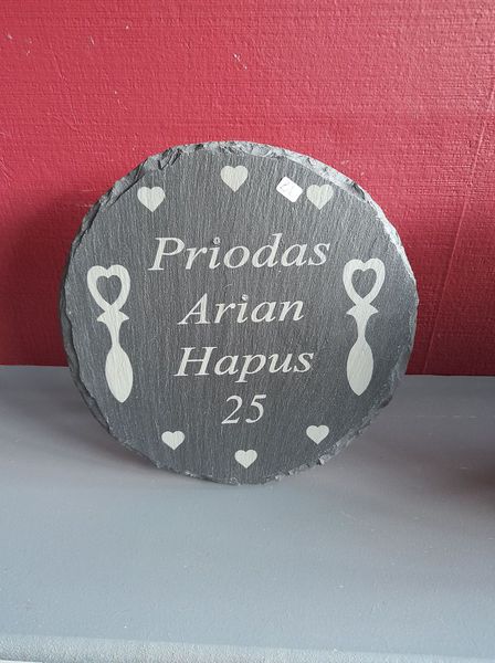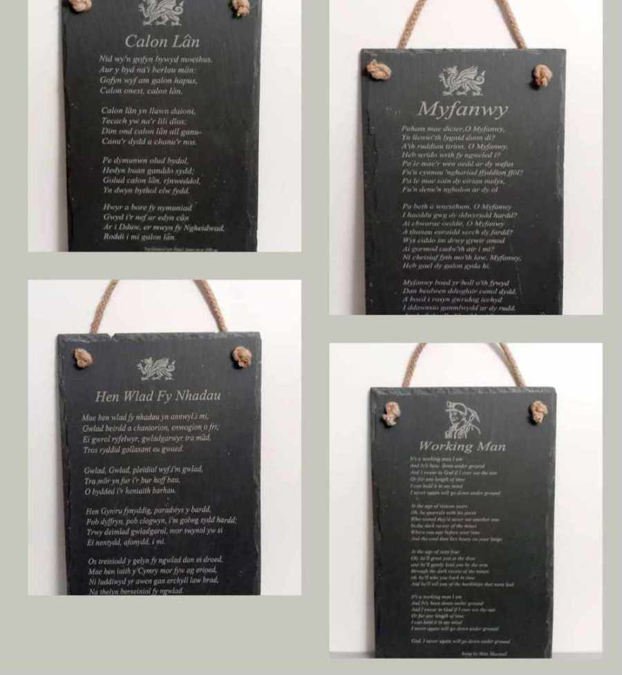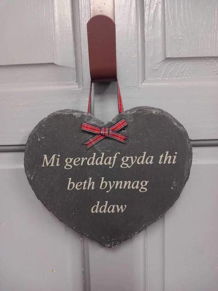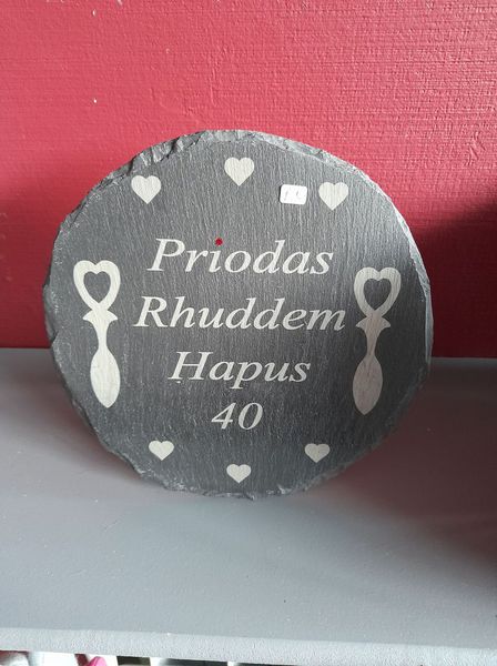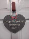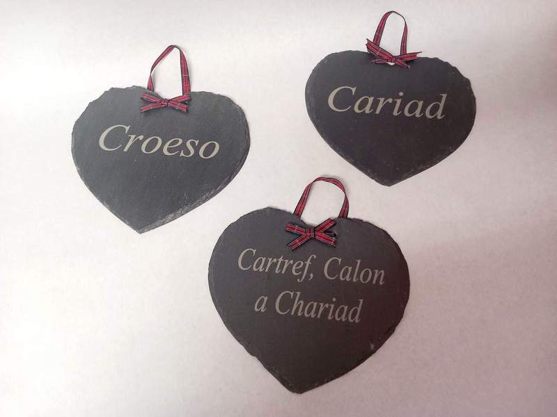 Round welsh slate plaques with Rwyt ti werth y byd at the top.